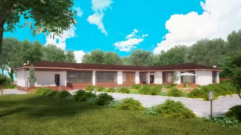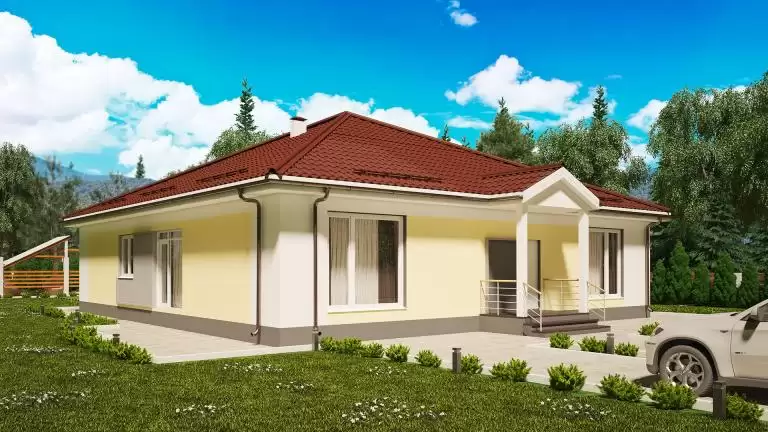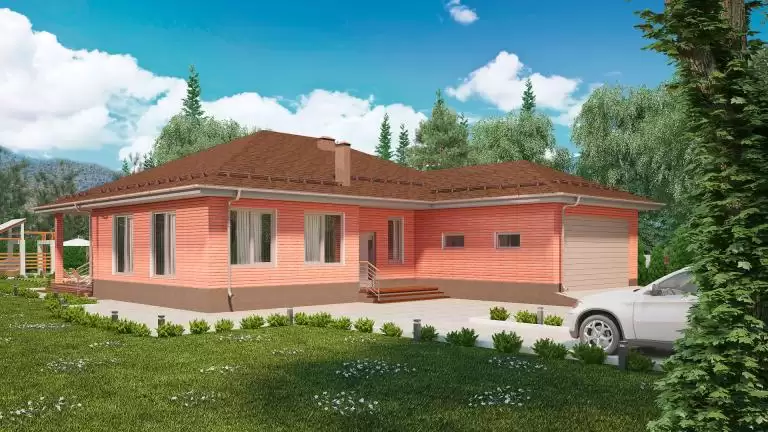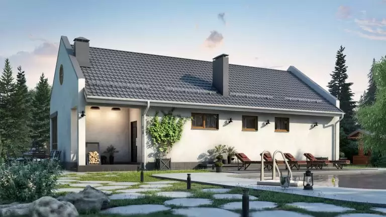 Современный одноэтажный дом с панорамными окнами удачный выбор для тех, кто любит, когда вокруг много света. Большая площадь остекления обеспечат максимальный уровень естественного освещения в доме.